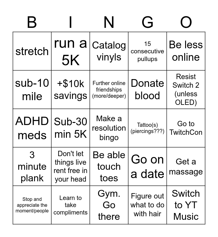 This bingo card has a free space and 24 words: Don't let things live rent free in your head, Learn to take compliments, Further online friendships (more/deeper), Stop and appreciate the moment/people, Be less online, stretch, sub-10 mile, run a 5K, Tattoo(s)(piercings???), Be able touch toes, Donate blood, ADHD meds, Go on a date, Get a massage, +$10k savings, Figure out what to do with hair, Go to TwitchCon, Catalog vinyls, Resist Switch 2 (unless OLED), Sub-30 min 5K, Switch to YT Music, 3 minute plank, 15 consecutive pullups and Gym. Go there.