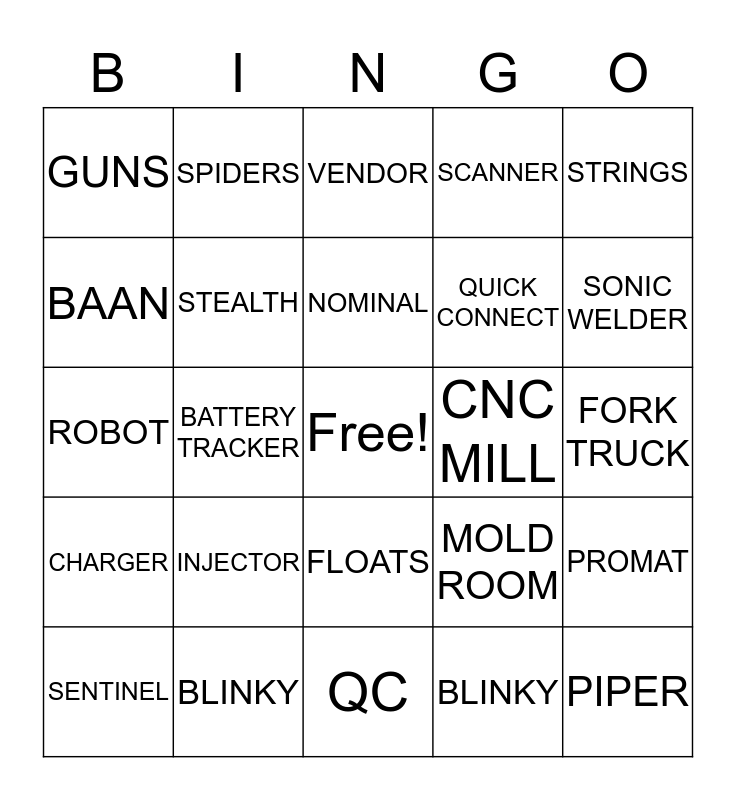 This bingo card has a free space and 24 words: INJECTOR, BLINKY, NOMINAL, SENTINEL, STRINGS, GUNS, BAAN, SPIDERS, CNC MILL, FLOATS, QUICK CONNECT, ROBOT, MOLD ROOM, PROMAT, STEALTH, BLINKY, FORK TRUCK, VENDOR, SONIC WELDER, BATTERY TRACKER, PIPER, CHARGER, SCANNER and QC.