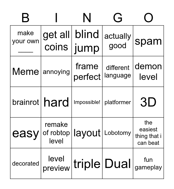 This bingo card has a free space and 39 words: feature worthy, empty level, unnamed 0, annoying, decorated, layout, frame perfect, copied level, spam, easy, hard, actually good, fun gameplay, 3D, platformer, remake of robtop level, fun gimmick, make your own ____, XL level, Lobotomy, Meme, triple, different language, demon level, portal or orb spam, yt-er challenge, makes me laugh, blind jump, beat in 1 attempt, get all coins, 2.2 filter, camera controls, blind jump, level preview, Dual, stereo madness song, the easiest thing that i can beat, brainrot and fire in the hole.