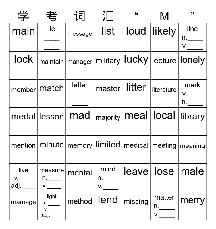 This bingo card has a free space and 48 words: leave, lecture, lend, lesson, letter ____ ____, library, lie ____ ____, light n.____ v.____ adj.____, likely, limited, line n.____ v.____, list, literature, litter, live v.____ adj.____, local, lock, lonely, lose, loud, lucky, mad, main, maintain, male, manager, mark v.____ n.____, marriage, master, match, matter n.____ v.____, meal, meaning, measure n.____ v.____, medal, medical, meeting, member, memory, mental, mention, merry, message, method, military, mind n.____ v.____, minute and missing.