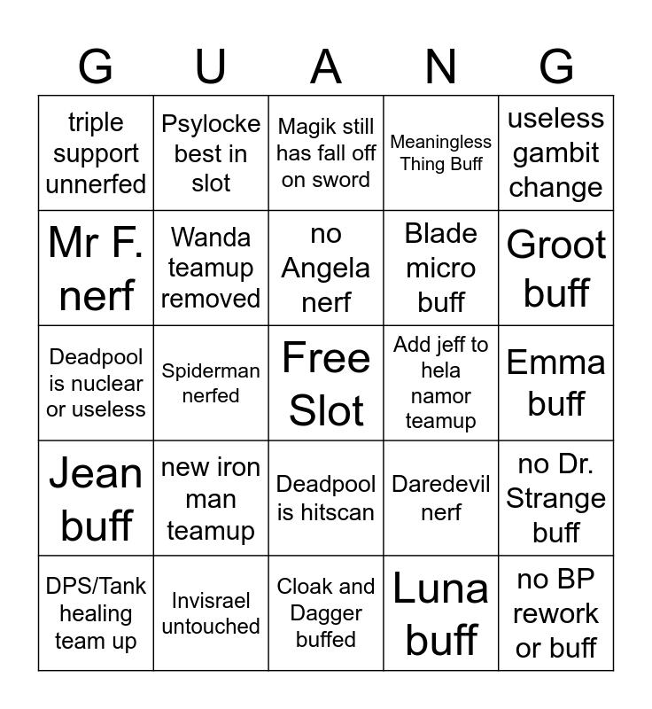 This bingo card has a free space and 24 words: new iron man teamup, Invisrael untouched, no Angela nerf, DPS/Tank healing team up, useless gambit change, triple support unnerfed, Mr F. nerf, Psylocke best in slot, Add jeff to hela namor teamup, Deadpool is hitscan, Blade micro buff, Deadpool is nuclear or useless, Daredevil nerf, no Dr. Strange buff, Wanda teamup removed, Luna buff, Emma buff, Magik still has fall off on sword, Groot buff, Spiderman nerfed, no BP rework or buff, Jean buff, Meaningless Thing Buff and Cloak and Dagger buffed.