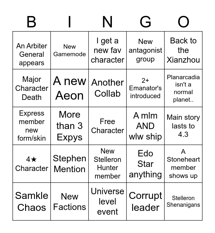 This bingo card has a free space and 24 words: Stephen Mention, New Factions, Another Collab, Samkle Chaos, Back to the Xianzhou, An Arbiter General appears, Major Character Death, New Gamemode, A mlm AND wlw ship, New Stelleron Hunter member, 2+ Emanator's introduced, Express member new form/skin, Edo Star anything, A Stoneheart member shows up, A new Aeon, Corrupt leader, Main story lasts to 4.3, I get a new fav character, Planarcadia isn't a normal planet.., More than 3 Expys, Stelleron Shenanigans, 4★ Character, New antagonist group and Universe level event.