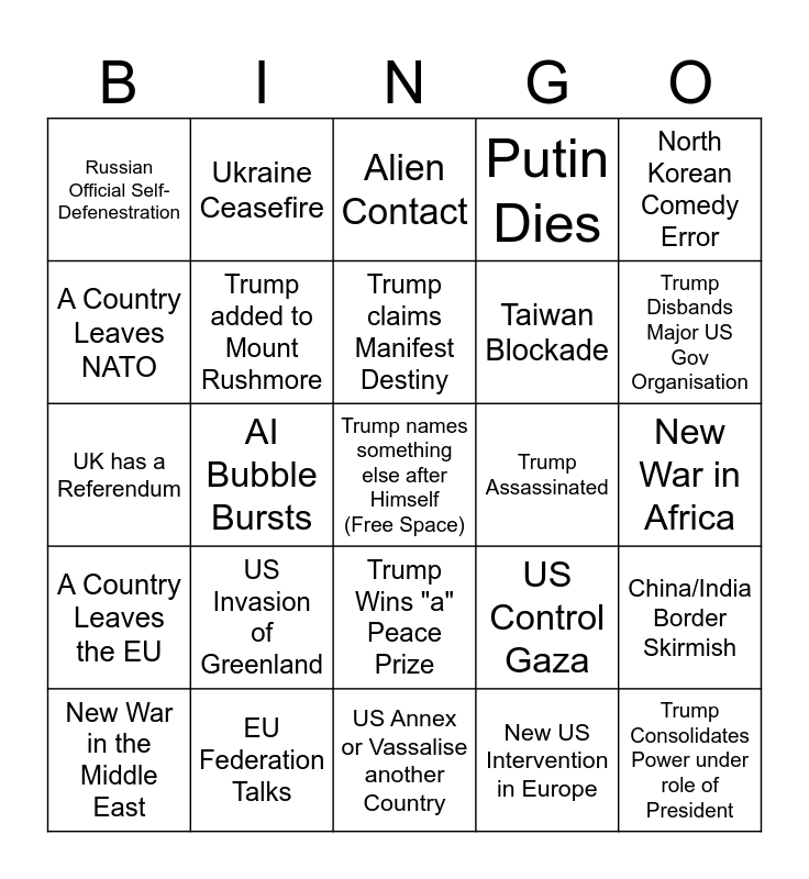 This bingo card has a free space and 24 words: US Invasion of Greenland, EU Federation Talks, Trump claims Manifest Destiny, New War in the Middle East, North Korean Comedy Error, Russian Official Self-Defenestration, A Country Leaves NATO, Ukraine Ceasefire, Trump Assassinated, Trump Wins "a" Peace Prize, Taiwan Blockade, UK has a Referendum, US Control Gaza, China/India Border Skirmish, Trump added to Mount Rushmore, New US Intervention in Europe, New War in Africa, Alien Contact, Trump Disbands Major US Gov Organisation, AI Bubble Bursts, Trump Consolidates Power under role of President, A Country Leaves the EU, Putin Dies and US Annex or Vassalise another Country.