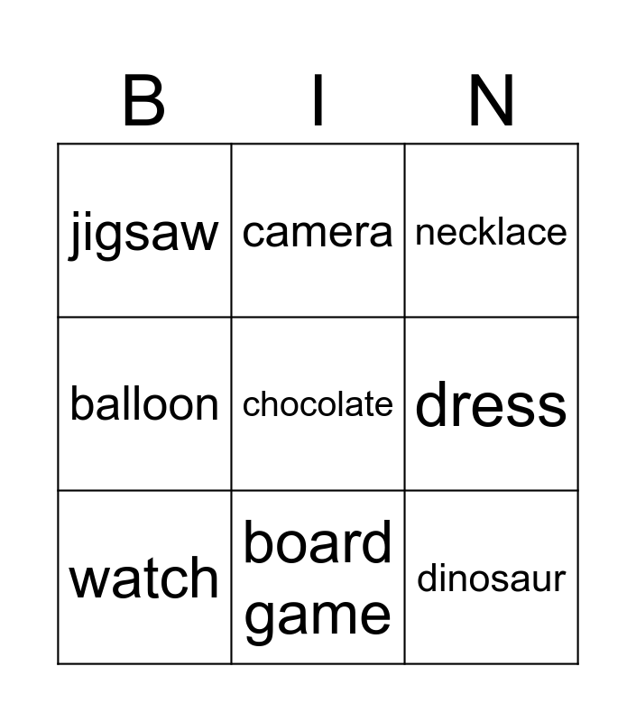 This bingo card has 10 words: board game, necklace, jigsaw, chocolate, balloon, watch, camera, umbrella, dress and dinosaur.