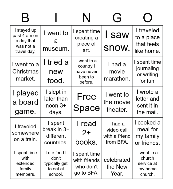 This bingo card has a free space and 24 words: I spent break in 3+ different countries., I ate food I don't typically get to eat at school., I went to a country I have never been to before., I spent time with extended family members., I traveled to a place that feels like home., I stayed up past 4 am on a day that was not a travel day., I went to a Christmas market., I went to a museum., I went to the movie theater., I read 2+ books., I had a movie marathon., I played a board game., I had a video call with a friend from BFA., I cooked a meal for my family or friends., I tried a new food., I celebrated the New Year., I wrote a letter and sent it in the mail., I spent time creating a piece of art., I spent time journaling or writing for fun., I slept in later than noon 3+ days., I went to a church service at my home church., I traveled somewhere on a train., I saw snow. and I spent time with friends who don't go to BFA..