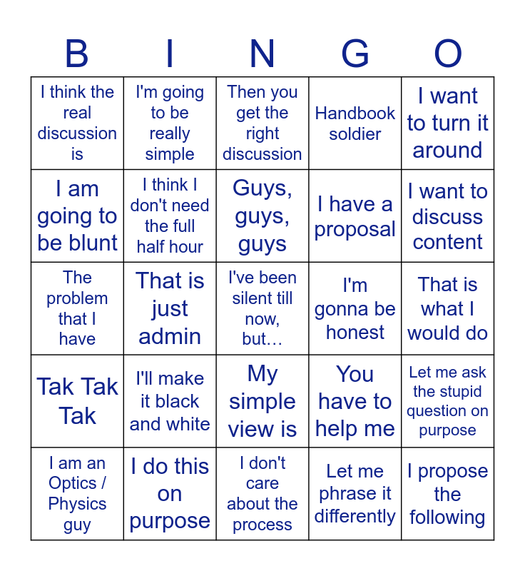 This bingo card has a free space and 24 words: I'll make it black and white, I do this on purpose, Guys, guys, guys, I am an Optics / Physics guy, I want to turn it around, I think the real discussion is, I am going to be blunt, I'm going to be really simple, I'm gonna be honest, My simple view is, I have a proposal, The problem that I have, You have to help me, Let me ask the stupid question on purpose, I think I don't need the full half hour, Let me phrase it differently, That is what I would do, Then you get the right discussion, I want to discuss content, That is just admin, I propose the following, Tak Tak Tak, Handbook soldier and I don't care about the process.