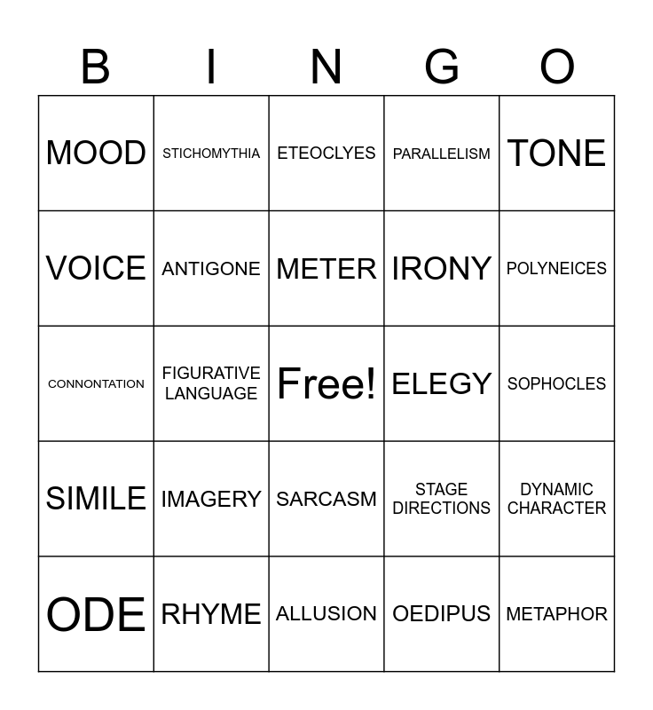 This bingo card has a free space and 24 words: IMAGERY, RHYME, METER, ODE, TONE, MOOD, VOICE, STICHOMYTHIA, ELEGY, SARCASM, IRONY, CONNONTATION, STAGE DIRECTIONS, DYNAMIC CHARACTER, ANTIGONE, OEDIPUS, SOPHOCLES, ETEOCLYES, POLYNEICES, FIGURATIVE LANGUAGE, METAPHOR, SIMILE, PARALLELISM and ALLUSION.