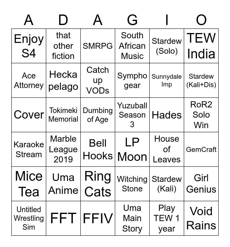 This bingo card has 36 words: Witching Stone, Ring Cats, Uma Main Story, Ace Attorney, Karaoke Stream, Yuzuball Season 3, Hecka pelago, FFIV, Stardew (Solo), Stardew (Kali), Stardew (Kali+Dis), South African Music, Girl Genius, Tokimeki Memorial, Sympho gear, Enjoy S4, Mice Tea, Hades, Cover, SMRPG, Dumbing of Age, Marble League 2019, LP Moon, Bell Hooks, House of Leaves, that other fiction, Sunnydale Imp, FFT, Catch up VODs, TEW India, Void Rains, Untitled Wrestling Sim, GemCraft, RoR2 Solo Win, Uma Anime and Play TEW 1 year.