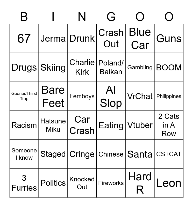 This bingo card has 37 words: Racism, Staged, Knocked Out, Crash Out, VrChat, 2 Cats in A Row, 67, Politics, Femboys, Chinese, Blue Car, BOOM, Drugs, Skiing, Car Crash, AI Slop, Santa, Guns, Gooner/Thirst Trap, Jerma, Drunk, Poland/ Balkan, Vtuber, CS+CAT, Someone I know, Hatsune Miku, Charlie Kirk, Fireworks, Hard R, Leon, IShowSpeed, Bare Feet, Cringe, Eating, Gambling, Philippines and 3 Furries.