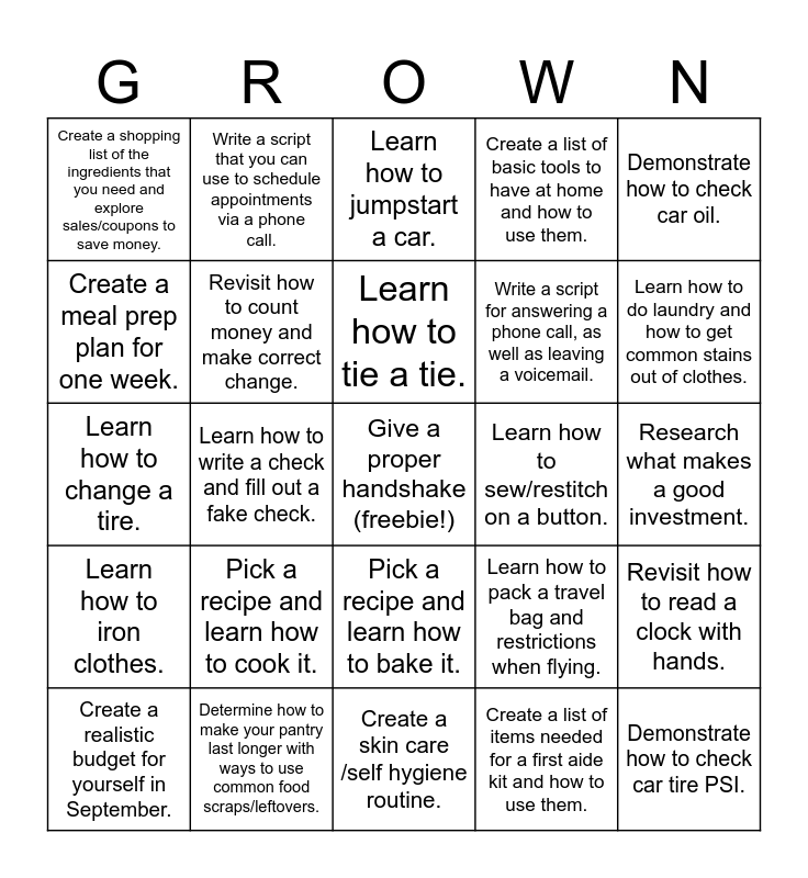 This bingo card has a free space and 24 words: Pick a recipe and learn how to cook it., Determine how to make your pantry last longer with ways to use common food scraps/leftovers., Learn how to tie a tie., Create a realistic budget for yourself in September., Demonstrate how to check car oil., Create a shopping list of the ingredients that you need and explore sales/coupons to save money., Create a meal prep plan for one week., Write a script that you can use to schedule appointments via a phone call., Learn how to sew/restitch on a button., Pick a recipe and learn how to bake it., Write a script for answering a phone call, as well as leaving a voicemail., Learn how to change a tire., Learn how to pack a travel bag and restrictions when flying., Revisit how to read a clock with hands., Revisit how to count money and make correct change., Create a list of items needed for a first aide kit and how to use them., Research what makes a good investment., Learn how to jumpstart a car., Learn how to do laundry and how to get common stains out of clothes., Learn how to write a check and fill out a fake check., Demonstrate how to check car tire PSI., Learn how to iron clothes., Create a list of basic tools to have at home and how to use them. and Create a skin care /self hygiene routine..