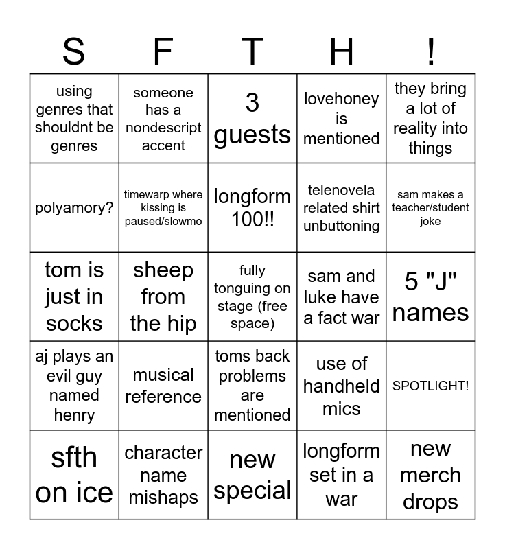 This bingo card has a free space and 24 words: musical reference, character name mishaps, longform 100!!, sfth on ice, they bring a lot of reality into things, using genres that shouldnt be genres, polyamory?, someone has a nondescript accent, sam and luke have a fact war, toms back problems are mentioned, telenovela related shirt unbuttoning, tom is just in socks, use of handheld mics, SPOTLIGHT!, timewarp where kissing is paused/slowmo, longform set in a war, 5 "J" names, 3 guests, sam makes a teacher/student joke, sheep from the hip, new merch drops, aj plays an evil guy named henry, lovehoney is mentioned and new special.