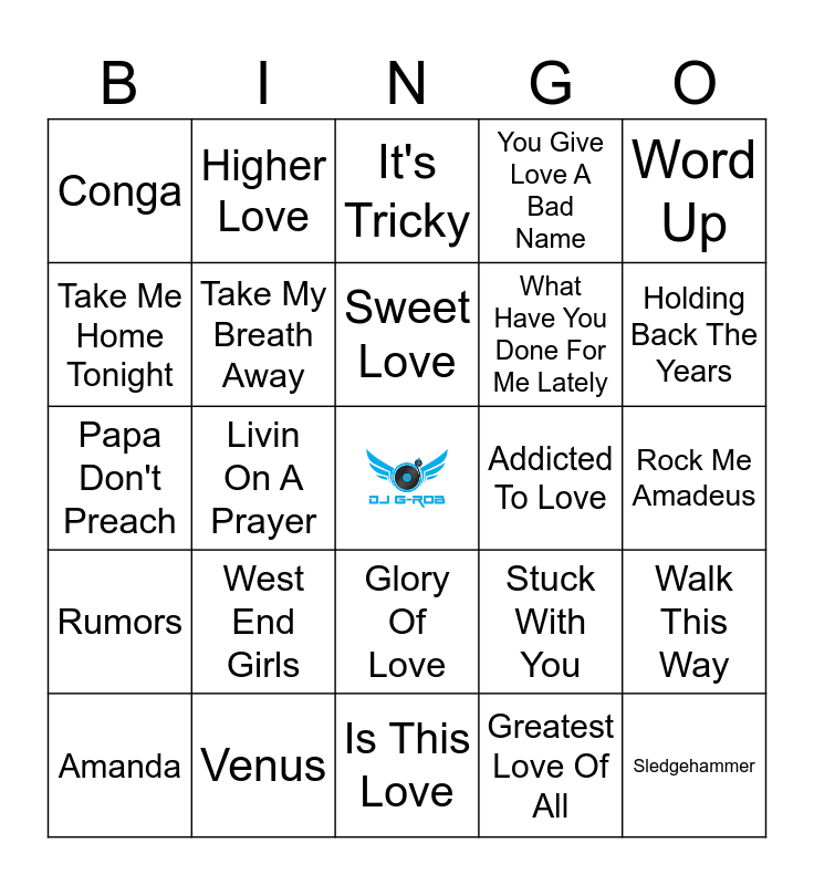 This bingo card has a free space and 41 words: Walk Like An Egyptian, Papa Don't Preach, Everybody Have Fun Tonight, Take My Breath Away, Venus, Glory Of Love, Sweet Love, Kiss, Word Up, Rumors, Livin On A Prayer, You Give Love A Bad Name, Sledgehammer, Rock Me Amadeus, Addicted To Love, West End Girls, Everybody Wants To Rule The World, Conga, True Blue, It's Tricky, Walk This Way, My Adidas, Is This Love, What Have You Done For Me Lately, Nasty, How Will I Know, Greatest Love Of All, Broken Wings, Holding Back The Years, La Isla Bonita, Secret Lovers, Higher Love, Amanda, Wanted Dead Or Alive, Stuck With You, Take Me Home Tonight, Dance Hall Days, The Final Countdown, The Way It Is, That's What Friends Are For and Hip To Be Square.