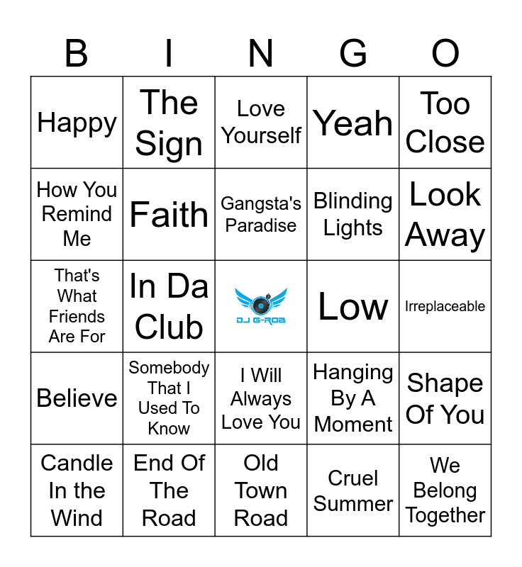 This bingo card has a free space and 41 words: Careless Whisper, That's What Friends Are For, Walk Like An Egyptian, Faith, End Of The Road, I Will Always Love You, Gangsta's Paradise, Macarena, Too Close, Believe, In Da Club, Yeah, We Belong Together, Irreplaceable, Low, Somebody That I Used To Know, Thrift Shop, Happy, Uptown Funk, Love Yourself, Shape Of You, God's Plan, Old Town Road, Blinding Lights, Levitating, Last Night, Cruel Summer, I Had Some Help, Look Away, Hold On, (Everything I Do) I Do It For You, The Sign, Candle In the Wind, Breathe, Hanging By A Moment, How You Remind Me, Bad Day, Boom Boom Pow, Tik Tok, Rolling In The Deep and Heat Waves.