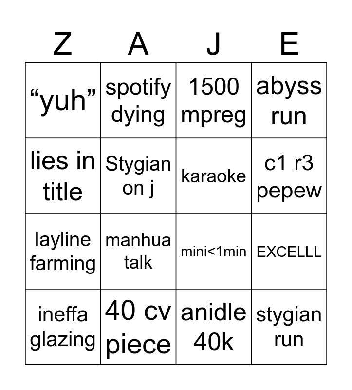This bingo card has 21 words: 40 cv piece, varesa flex, spotify dying, lies in title, anidle 40k, karaoke, “yuh”, 1500 mpreg, mini<1min, c1 r3 pepew, layline farming, abyss run, stygian run, 1500 YURI, Stygian on j, 5 ping redeems, ineffa glazing, manhua talk, lies in title, EXCELLL and mini<1min.
