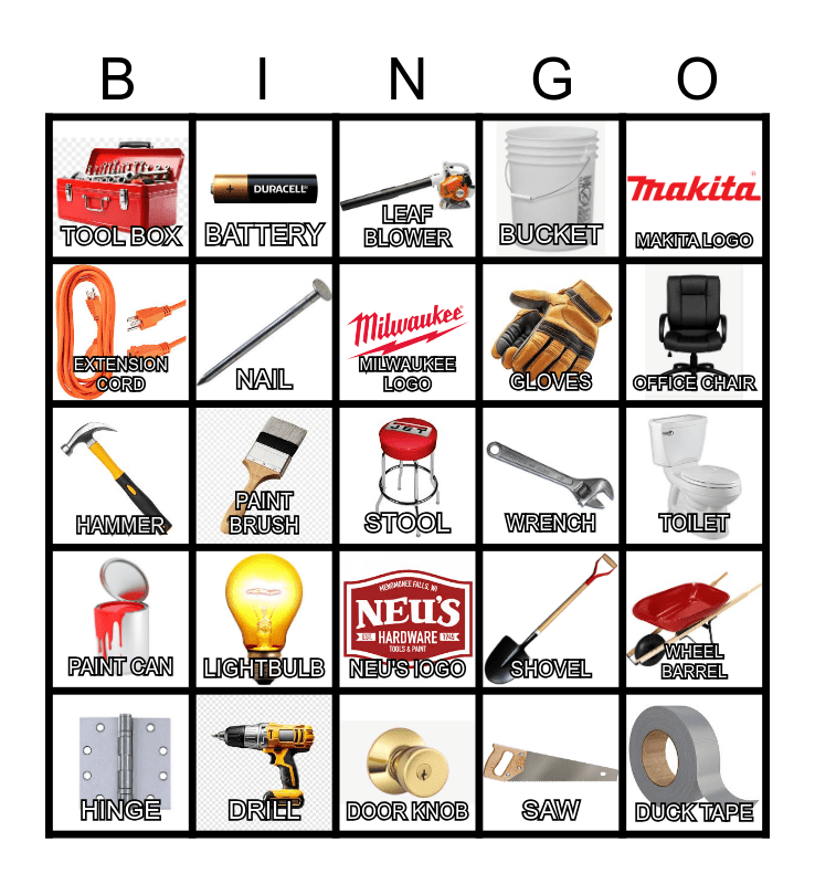 This bingo card has 40 images and 40 words: FAN, HAMMER, SCREW, NAIL, DRILL, NEU'S lOGO, MILWAUKEE LOGO, DEWALT LOGO, MAKITA LOGO, PAINT CAN, PAINT BRUSH, BUCKET, STOOL, TOILET, WRENCH, LIGHTBULB, LIGHT SWITCH, TOOL BOX, TAPE MEASURE, LEAF BLOWER, WHEEL BARREL, SAW, GLOVES, EXTENSION CORD, LADDER, TOOL BELT, HARD HAT, CHAINSAW, DUCK TAPE, WASHER, PLIERS, HINGE, PENCIL, SHOVEL, OFFICE CHAIR, DOOR KNOB, LOCK, DRILL BIT, BATTERY and GLUE.