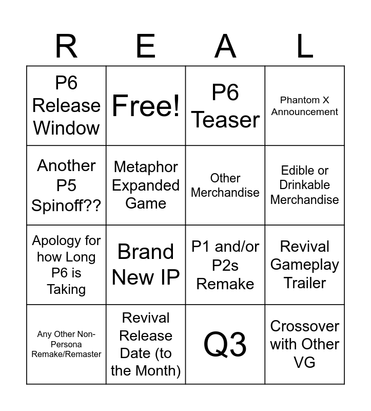 This bingo card has 16 words: Revival Release Date (to the Month), Revival Gameplay Trailer, P6 Teaser, P6 Release Window, Apology for how Long P6 is Taking, Free!, P1 and/or P2s Remake, Q3, Another P5 Spinoff??, Metaphor Expanded Game, Any Other Non- Persona Remake/Remaster, Phantom X Announcement, Brand New IP, Edible or Drinkable Merchandise, Other Merchandise and Crossover with Other VG.