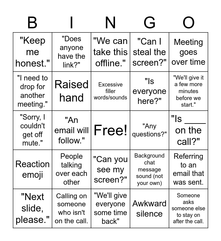This bingo card has a free space and 29 words: "Next slide, please.", Someone not on mute who should be., "An email will follow.", "If you're talking, you're on mute;", "Keep me honest.", "We can take this offline.", Raised hand, People talking over each other, "Any questions?", Calling on someone who isn't on the call., "Is ____ on the call?", Someone asks someone else to stay on after the call., "We'll give everyone some time back", Awkward silence, "We'll give it a few more minutes before we start.", "Can you loop me in?", "Can you see my screen?", Reaction emoji, Meeting goes over time, "Sorry, I couldn't get off mute.", Background chat message sound (not your own), Child or animal interruption, "Is everyone here?", "I need to drop for another meeting.", "Can I steal the screen?", "Does anyone have the link?", Referring to an email that was sent., Excessive filler words/sounds and "High level view".
