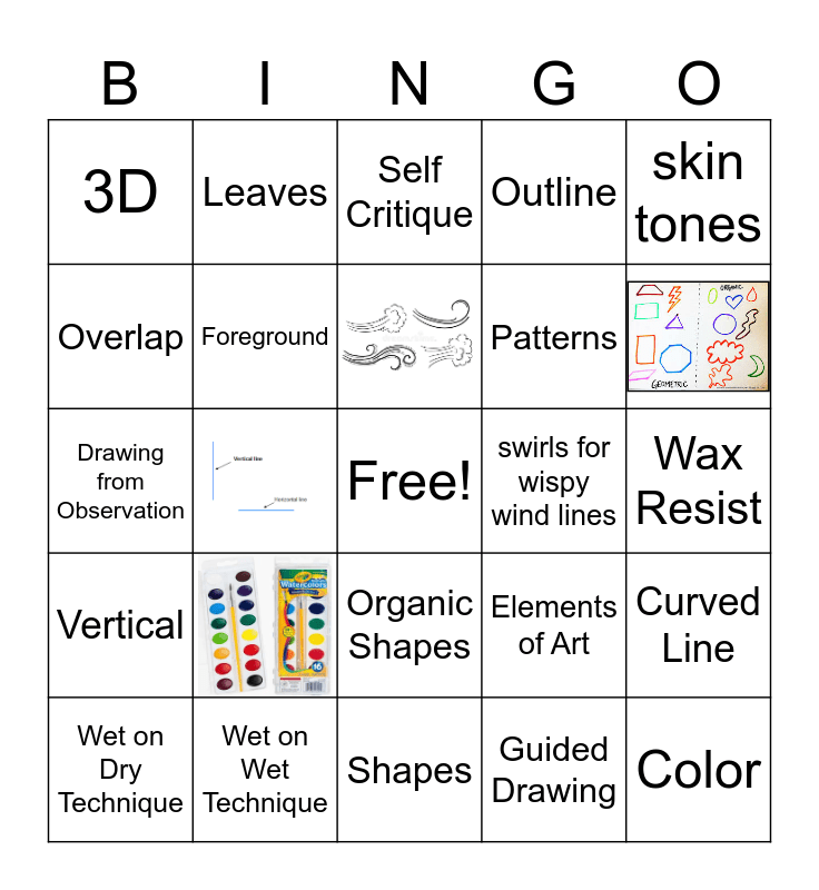 This bingo card has 12 images, a free space and 42 words: Self Portrait, Vertical, Horizontal, Background, Organic Shapes, Geometric Shapes, Outline, Trace to make lines "pop", Overlap, 2D, 3D, Watercolor, Wet on Wet Technique, Wet on Dry Technique, Lines, Shapes, Color, Patterns, Paintbrush on Tippy Toes, Wax Resist, Elements of Art, Communicate a story about a familiar place or object, swirls for wispy wind lines, skin tones, Fall, Leaves, Space, Cardboard Cutouts, Selfies looking up, Guided Drawing, Painting, Cutting, Craftmanship, Art Reflection, Self Critique, Difference between portrait and self portrait, Drawing from Observation, Curved Line, Variety, Foreground, Wash and Season.