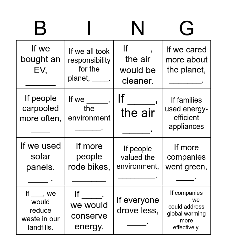 This bingo card has 16 words: If ____, we would conserve energy., If more companies went green, ____., If ____, the air would be cleaner., If we bought an EV, ______, If we used solar panels, ____ ., If we all took responsibility for the planet, ____., If people valued the environment, _________., If everyone drove less, ____., If people carpooled more often, ____, If we _____, the environment ______., If ___, we would reduce waste in our landfills., If we cared more about the planet, _______., If more people rode bikes, _______, If families used energy-efficient appliances, If ____, the air ____. and If companies _____, we could address global warming more effectively..