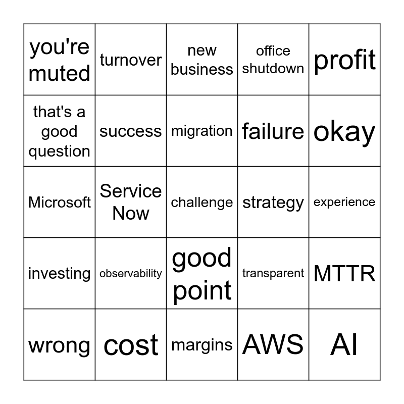 This bingo card has a free space and 49 words: cut cost, AI, Co-pilot, margins, observability, is my mic working?, turnover, quality, that's a good question, we are one team, success, office shutdown, MTTR, transparent, great, growth, migration, strategy, DB, profit, Service Now, AWS, you're muted, failure, security, okay, wrong, excellent question, good point, investing, money, procedure, schedule, budget, cost, price, milestones, high-level, experience, acquisition, action, millions, new building, new equipment, Microsoft, new business, JIRA, structure and expansion.