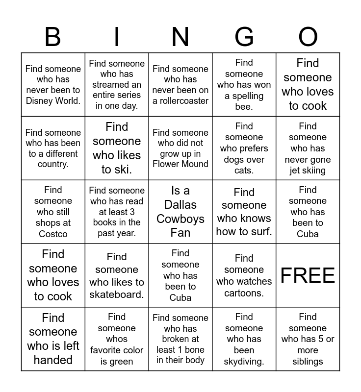 This bingo card has 50 words: Find someone who has the same birth month as you., Is a Dallas Cowboys Fan, Find someone who loves English., Find someone who has broken at least 1 bone in their body, Find someone who likes to skateboard., Find someone who plays a sport., Find someone who has streamed an entire series in one day., Find someone who likes Cats better than Dogs., Find someone who has been to a different country., Find someone who has at least 3 other siblings., Find someone who likes to ski., Find someone who has won a spelling bee., FREE, Find someone who watches cartoons., Find someone who plays an instrument., Find someone whos favorite color is blue, Find someone who did not grow up in Flower Mound, Find someone who knows how to surf., Find someone who has never been out of the country,, Find someone who loves to cook, Find someone who has read at least 3 books in the past year., Find someone who has been skydiving., Find someone who has never been to Disney World., Find someone who prefers dogs over cats., Find someone who has a strange pet animal., Find someone who has 5 or more siblings, Find someone who has never gone jet skiing, Find someone who has traveled to at least 4 countries, Find someone who has never been on a rollercoaster, Find someone who has been to Cuba, Find someone who likes Cats better than Dogs, Find someone who does not have a passport, Find someone who watches Game of Thrones, Find someone who has never been to Disney, Find someone whos favorite color is green, Find someone who has never gone jet skiing, Find someone whos favorite color is red, Find someone who still shops at Costco, Find someone who is afraid of heights, Find someone who has been to Cuba, Find someone that is allergic to avocado, Find someone that speaks more than 2 languages, Find someone who has never been to Disney, Find someone who loves to cook, Find someone who is left handed, Find someone who still shops at Costco, Find someone who has owned a motorcycle, Find someone whos birthday is on a holiday, Find someone who loves to cook and Find someone who has never been to Disney.