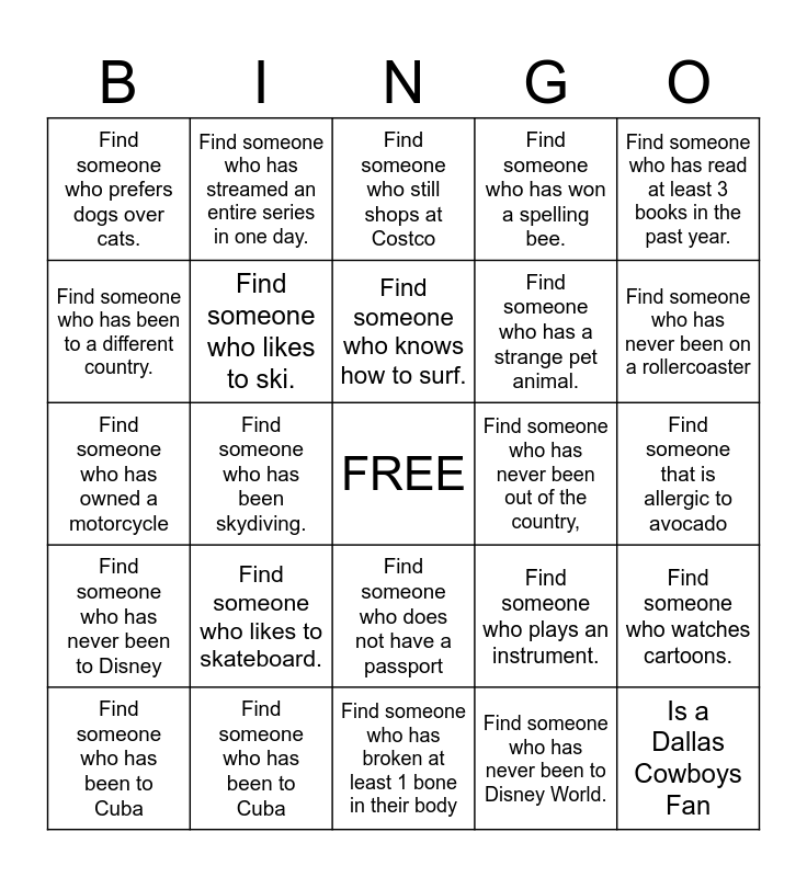 This bingo card has a free space and 46 words: Find someone who has the same birth month as you., Is a Dallas Cowboys Fan, Find someone who loves English., Find someone who has broken at least 1 bone in their body, Find someone who likes to skateboard., Find someone who plays a sport., Find someone who has streamed an entire series in one day., Find someone who likes Cats better than Dogs., Find someone who has been to a different country., Find someone who has at least 3 other siblings., Find someone who likes to ski., Find someone who has won a spelling bee., Find someone who watches cartoons., Find someone who plays an instrument., Find someone whos favorite color is blue, Find someone who did not grow up in Flower Mound, Find someone who knows how to surf., Find someone who has never been out of the country,, Find someone who loves to cook, Find someone who has read at least 3 books in the past year., Find someone who has been skydiving., Find someone who has never been to Disney World., Find someone who prefers dogs over cats., Find someone who has a strange pet animal., Find someone who has traveled to at least 4 countries, Find someone who has never been on a rollercoaster, Find someone who has been to Cuba, Find someone who likes Cats better than Dogs, Find someone who does not have a passport, Find someone who has never been to Disney, Find someone whos favorite color is green, Find someone who has never gone jet skiing, Find someone whos favorite color is red, Find someone who still shops at Costco, Find someone who is afraid of heights, Find someone who has been to Cuba, Find someone that is allergic to avocado, Find someone that speaks more than 2 languages, Find someone who has never been to Disney, Find someone who loves to cook, Find someone who is left handed, Find someone who still shops at Costco, Find someone who has owned a motorcycle, Find someone whos birthday is on a holiday, Find someone who loves to cook and Find someone who has never been to Disney.