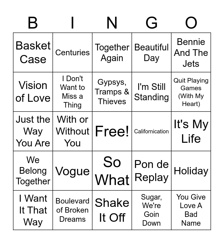 This bingo card has a free space and 38 words: Rhiannon, Everywhere, Dream On, I Don't Want to Miss a Thing, Holiday, Vogue, Gypsys, Tramps & Thieves, Believe, Bennie And The Jets, I'm Still Standing, With or Without You, Beautiful Day, You Give Love A Bad Name, It's My Life, Vision of Love, We Belong Together, Nasty, Together Again, Under The Bridge, Californication, Basket Case, Boulevard of Broken Dreams, Quit Playing Games (With My Heart), I Want It That Way, Tim McGraw, Shake It Off, Crazy In Love, Cuff It, Party In The U.S.A., Flowers, There You Go, So What, Sugar, We're Goin Down, Centuries, We Found Love, Pon de Replay, Just the Way You Are and 24K Magic.