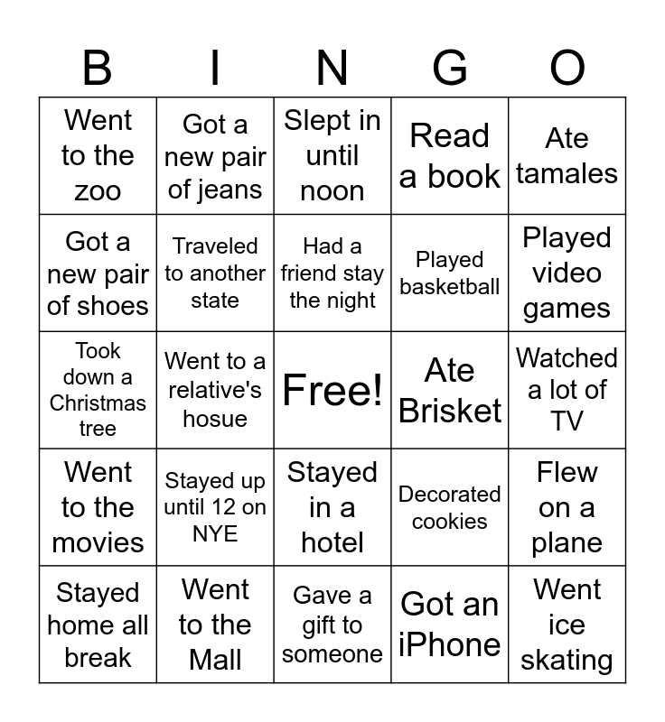This bingo card has a free space and 24 words: Stayed up until 12 on NYE, Went to the Mall, Had a friend stay the night, Stayed home all break, Ate tamales, Went to the zoo, Got a new pair of shoes, Got a new pair of jeans, Ate Brisket, Stayed in a hotel, Played basketball, Took down a Christmas tree, Decorated cookies, Flew on a plane, Traveled to another state, Got an iPhone, Watched a lot of TV, Slept in until noon, Played video games, Went to a relative's hosue, Went ice skating, Went to the movies, Read a book and Gave a gift to someone.