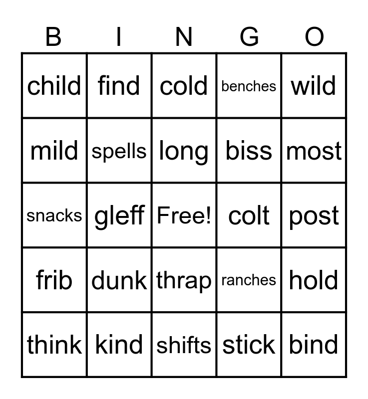 This bingo card has a free space and 24 words: think, dunk, long, stick, wild, child, find, cold, colt, post, snacks, spells, ranches, hold, mild, kind, shifts, benches, most, frib, gleff, thrap, biss and bind.