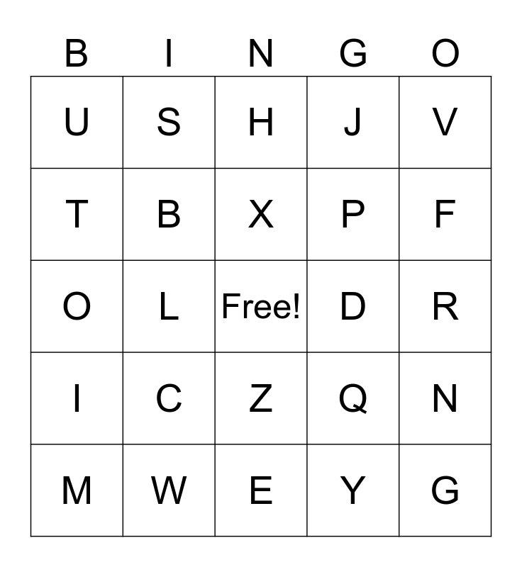 This bingo card has a free space and 26 words: Z, Y, X, W, V, U, T, S, R, Q, P, O, N, M, L, K, J, I, H, G, F, E, D, C, B and A.