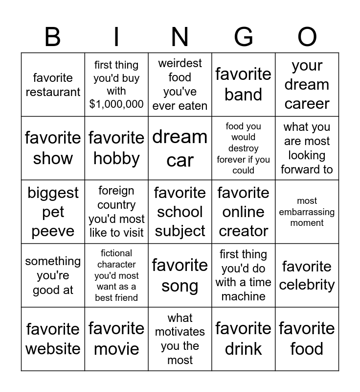 This bingo card has a free space and 24 words: fictional character you'd most want as a best friend, favorite movie, dream car, favorite website, your dream career, favorite restaurant, favorite show, first thing you'd buy with $1,000,000, favorite online creator, favorite song, food you would destroy forever if you could, biggest pet peeve, first thing you'd do with a time machine, favorite celebrity, favorite hobby, favorite drink, most embarrassing moment, weirdest food you've ever eaten, what you are most looking forward to, foreign country you'd most like to visit, favorite food, something you're good at, favorite band and what motivates you the most.