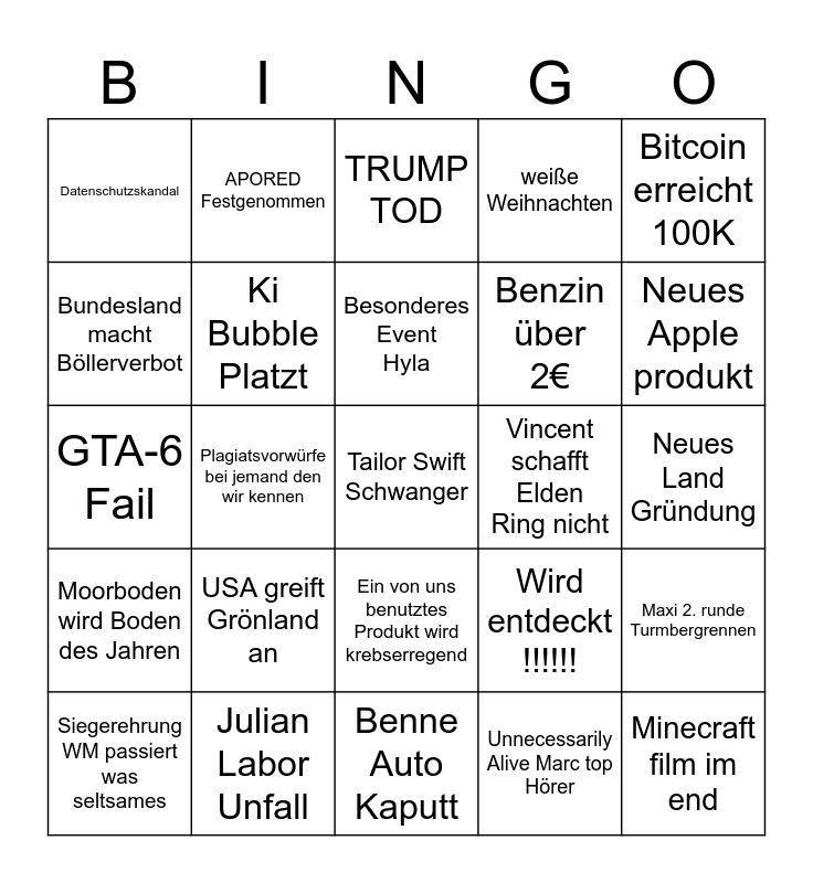 This bingo card has 25 words: USA greift Grönland an, Benne Auto Kaputt, Besonderes Event Hyla, Siegerehrung WM passiert was seltsames, Bitcoin erreicht 100K, Datenschutzskandal, Bundesland macht Böllerverbot, APORED Festgenommen, Vincent schafft Elden Ring nicht, Ein von uns benutztes Produkt wird krebserregend, Benzin über 2€, GTA-6 Fail, Wird entdeckt !!!!!!, Maxi 2. runde Turmbergrennen, Ki Bubble Platzt, Minecraft film im end, Neues Land Gründung, TRUMP TOD, Neues Apple produkt, Plagiatsvorwürfe bei jemand den wir kennen, Tailor Swift Schwanger, Julian Labor Unfall, Moorboden wird Boden des Jahren, weiße Weihnachten and Unnecessarily Alive Marc top Hörer.