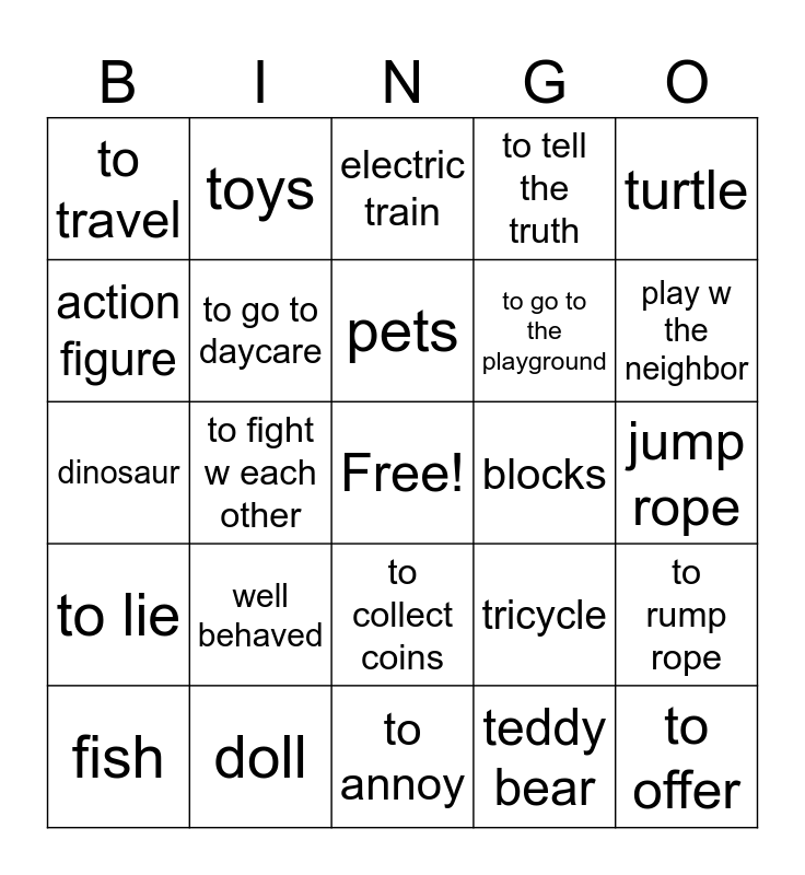 This bingo card has a free space and 24 words: well behaved, doll, pets, fish, turtle, to travel, action figure, toys, blocks, to collect coins, to go to the playground, dinosaur, tricycle, to rump rope, to go to daycare, teddy bear, jump rope, electric train, play w the neighbor, to fight w each other, to offer, to lie, to tell the truth and to annoy.