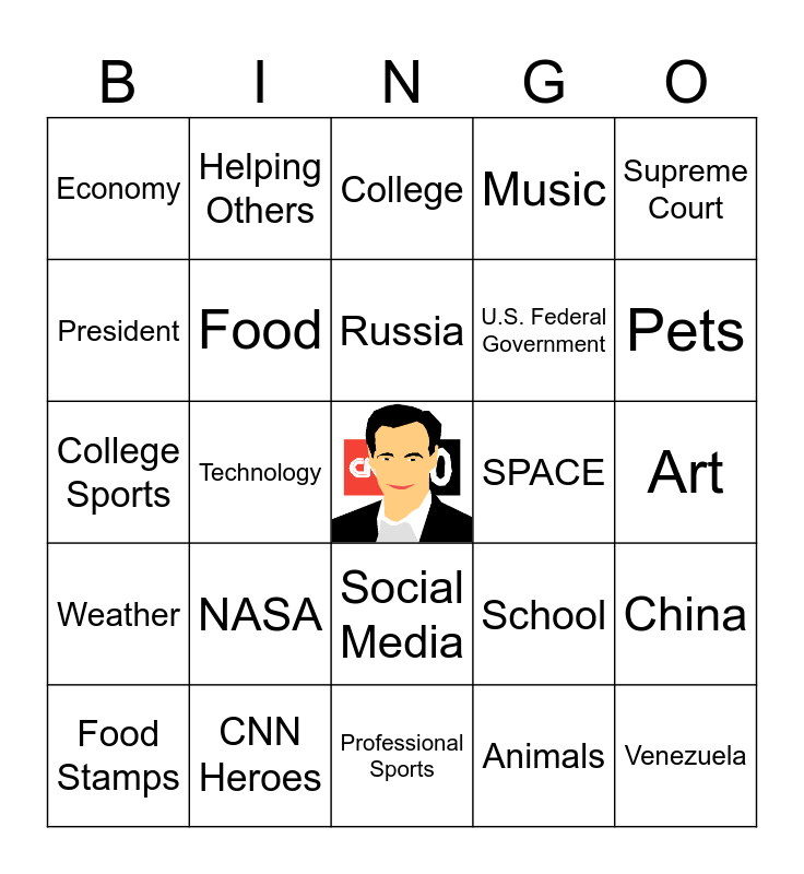 This bingo card has a free space and 24 words: NASA, CNN Heroes, Russia, Food Stamps, Supreme Court, Economy, President, Helping Others, SPACE, Social Media, U.S. Federal Government, College Sports, School, China, Food, Animals, Art, College, Pets, Technology, Venezuela, Weather, Music and Professional Sports.
