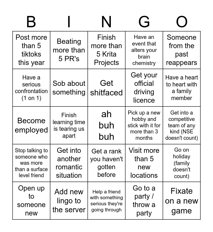 This bingo card has a free space and 24 words: Get into another romantic situation, Add new lingo to the server, Get shitfaced, Open up to someone new, Someone from the past reappears, Post more than 5 tiktoks this year, Have a serious confrontation (1 on 1), Beating more than 5 PR's, Pick up a new hobby and stick with it for more than 3 months, Get a rank you haven't gotten before, Get your official driving licence, Become employed, Visit more than 5 new locations, Go on holiday (family doesn't count), Sob about something, Go to a party / throw a party, Get into a competitive team of any kind (NSE doesn't count), Finish more than 5 Krita Projects, Have a heart to heart with a family member, Finish learning time is tearing us apart, Fixate on a new game, Stop talking to someone who was more than a surface level friend, Have an event that alters your brain chemistry and Help a friend with something serious they're going through.