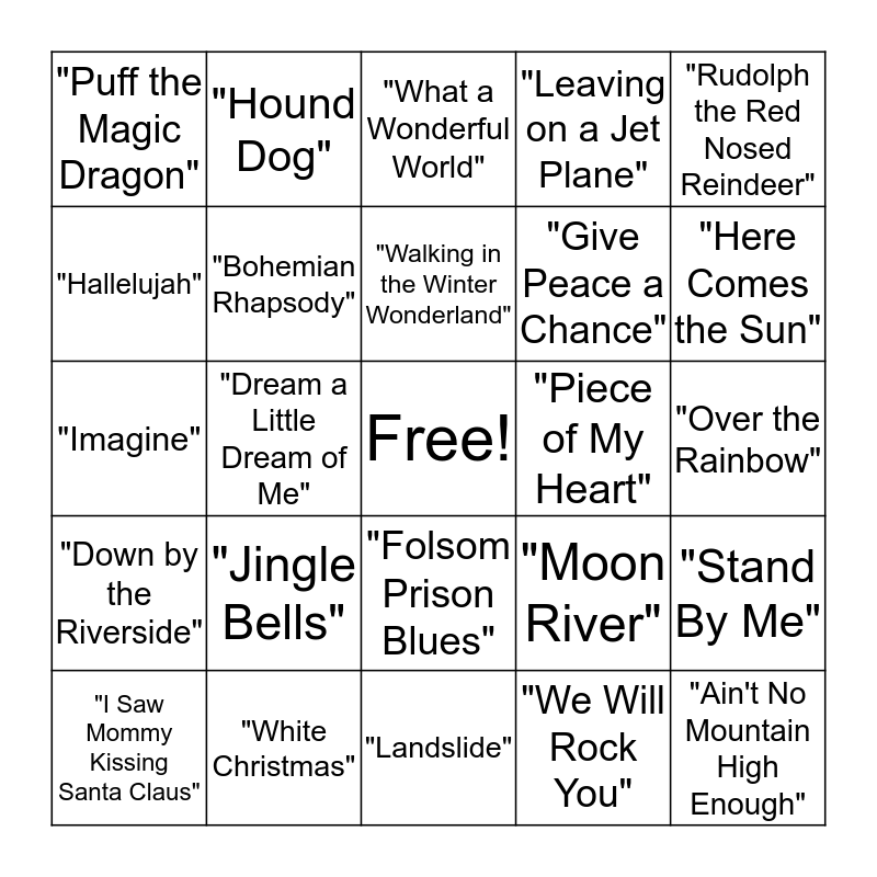 This bingo card has a free space and 24 words: "Jingle Bells", "White Christmas", "Walking in the Winter Wonderland", "I Saw Mommy Kissing Santa Claus", "Rudolph the Red Nosed Reindeer", "Puff the Magic Dragon", "Hallelujah", "Hound Dog", "Piece of My Heart", "Folsom Prison Blues", "Give Peace a Chance", "Imagine", "Moon River", "Stand By Me", "Bohemian Rhapsody", "We Will Rock You", "Over the Rainbow", "What a Wonderful World", "Here Comes the Sun", "Dream a Little Dream of Me", "Ain't No Mountain High Enough", "Down by the Riverside", "Leaving on a Jet Plane" and "Landslide".