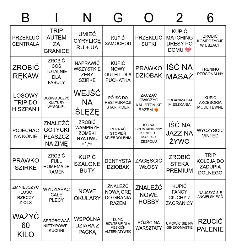 This bingo card has a free space and 48 words: ZNALEŹĆ NOWE HOBBY, IŚĆ NA MASAŻ, KUPIĆ BIŻUTERIĘ DLA MĘSKICH ALTERNATYWEK, ZNALEŹĆ GOTYCKI PŁASZCZ NA ZIMĘ, WEJŚĆ NA ŚLĘŻĘ, WYCZYŚCIĆ VINTED, TRIP AUTEM ZA GRANICĘ, SPRÓBOWAĆ NIETYPOWEJ KUCHNI, KUPIĆ MATCHING DRESY PO DOMU 💖, DENTYSTA DZIOBAK, ZROBIĆ KOMPOZYCJE W USZACH, KUPIĆ SAMOCHÓD, ORGANIZACJA MIESZKANIA, ZACZĄĆ ĆWICZYĆ KALISTENIKĘ RAZEM ❤️🔥, ZMNIEJSZYĆ ILOŚĆ RZECZY Z OLX, IŚĆ NA JAZZ NA ŻYWO, ZROBIĆ RĘKAW, TRENING PERSONALNY, KUPIĆ FANCY CIUCHY Z ZAGRANICY, PRZEKŁUĆ SUTKI, PRAWKO DZIOBAK, ZROBIĆ WAMPIRZE ZOMBKI NYA UWU =^.^=, PRZEKŁUĆ CENTRALA, ZROBIĆ COŚ TOTALNIE DLA FABUŁY, NAUCZYĆ SIĘ ANGIELSKIEGO, NAPRAWIĆ WSZYSTKIE ZĘBY SZIRKE, KUPIĆ AKCESORIA MODLITEWNE, WAŻYĆ 60 KILO, PÓJŚĆ DO RESTAURACJI STAR RIDER, DOŚWIADCZYĆ KULTURY WYSOKIEJ, UMOWÌC SIĘ NA GINEKOMASTIĘ, IŚĆ NA SPONTANICZNY KONCERT MAŁEGO ZESPOŁU, TRIP KOLEJĄ DO ZADUPIA DOLNEGO, WYDZIARAĆ CAŁE PLECY, POJECHAĆ NA KONIE, ZAGĘŚCIĆ WŁOSY, ZROBIĆ STEKA PREMIUM, LOSOWY TRIP DO HISZPANII, KUPIĆ SZALONE BUTY, NOWE OKULARY, PRAWKO SZIRKE, RZUCIĆ PALENIE, UMIEĆ CYRYLICĘ RU + UA, WSPÓLNA DZIARA Z PAĆKĄ, KUPIĆ NOWY OUTFIT DLA PUCHATKA, ZNALEŹĆ NOWĄ GRĘ DO GRANIA RAZEM, ZROBIĆ FULL HOMEMADE RAMEN and PÓJŚĆ NA WARSZTATY.