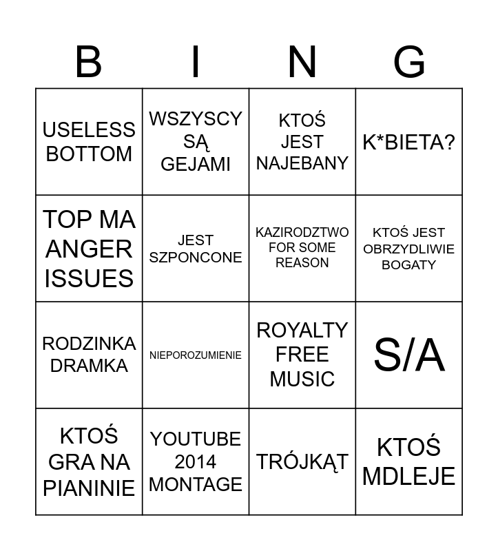 This bingo card has 16 words: YOUTUBE 2014 MONTAGE, S/A, KTOŚ JEST NAJEBANY, USELESS BOTTOM, RODZINKA DRAMKA, WSZYSCY SĄ GEJAMI, ROYALTY FREE MUSIC, TRÓJKĄT, TOP MA ANGER ISSUES, JEST SZPONCONE, KTOŚ GRA NA PIANINIE, K*BIETA?, NIEPOROZUMIENIE, KTOŚ JEST OBRZYDLIWIE BOGATY, KAZIRODZTWO FOR SOME REASON and KTOŚ MDLEJE.