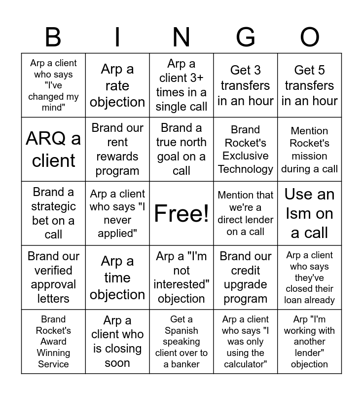 This bingo card has a free space and 24 words: Arp a time objection, Arp a client who is closing soon, Brand a true north goal on a call, Brand Rocket's Award Winning Service, Get 5 transfers in an hour, Arp a client who says "I've changed my mind", ARQ a client, Arp a rate objection, Mention that we're a direct lender on a call, Arp a "I'm not interested" objection, Brand Rocket's Exclusive Technology, Brand a strategic bet on a call, Brand our credit upgrade program, Arp a client who says they've closed their loan already, Brand our rent rewards program, Arp a client who says "I was only using the calculator", Use an Ism on a call, Arp a client 3+ times in a single call, Mention Rocket's mission during a call, Arp a client who says "I never applied", Arp "I'm working with another lender" objection, Brand our verified approval letters, Get 3 transfers in an hour and Get a Spanish speaking client over to a banker.