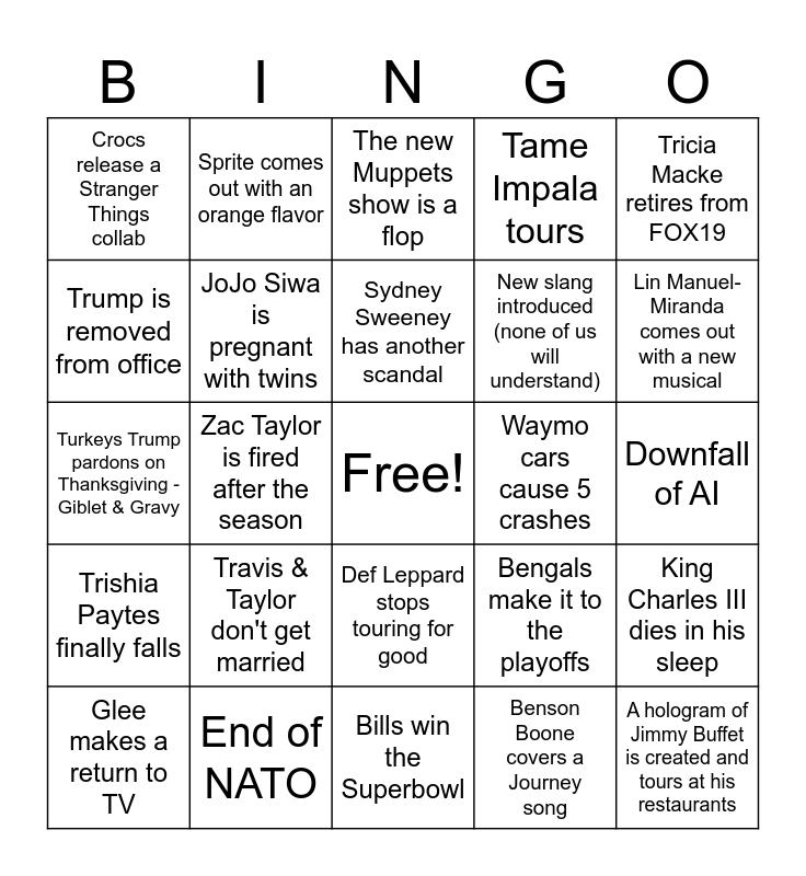 This bingo card has a free space and 24 words: Travis & Taylor don't get married, End of NATO, Sydney Sweeney has another scandal, Glee makes a return to TV, Tricia Macke retires from FOX19, Crocs release a Stranger Things collab, Trump is removed from office, Sprite comes out with an orange flavor, Waymo cars cause 5 crashes, Def Leppard stops touring for good, New slang introduced (none of us will understand), Turkeys Trump pardons on Thanksgiving -Giblet & Gravy, Bengals make it to the playoffs, King Charles III dies in his sleep, JoJo Siwa is pregnant with twins, Benson Boone covers a Journey song, Downfall of AI, The new Muppets show is a flop, Lin Manuel-Miranda comes out with a new musical, Zac Taylor is fired after the season, A hologram of Jimmy Buffet is created and tours at his restaurants, Trishia Paytes finally falls, Tame Impala tours and Bills win the Superbowl.