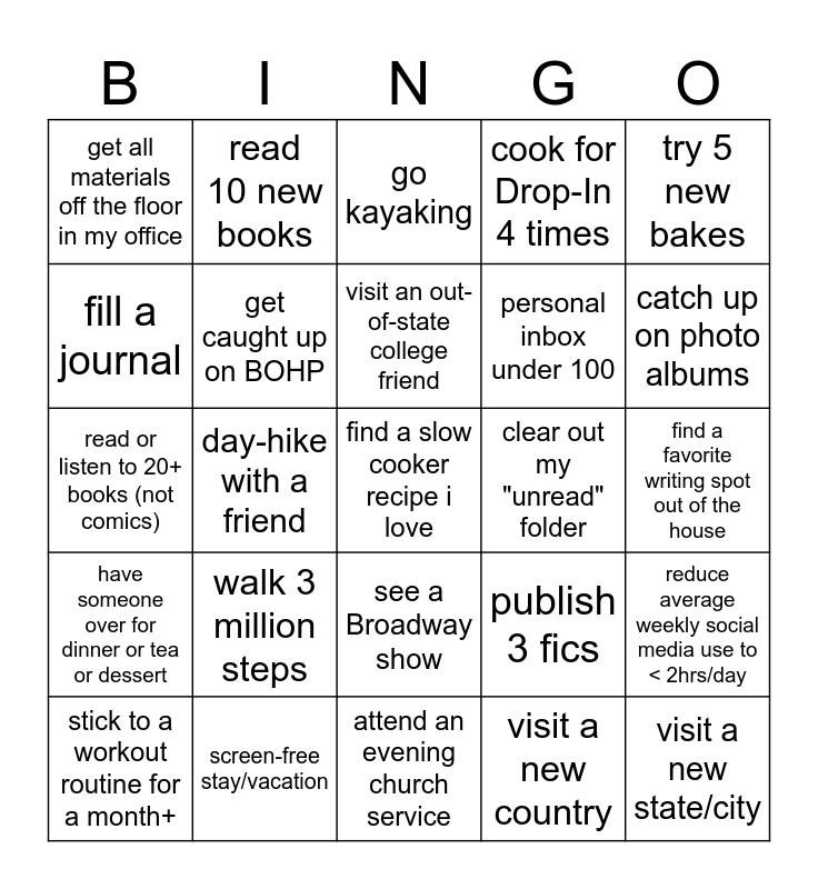 This bingo card has 25 words: walk 3 million steps, attend an evening church service, visit an out-of-state college friend, stick to a workout routine for a month+, try 5 new bakes, get all materials off the floor in my office, fill a journal, read 10 new books, clear out my "unread" folder, see a Broadway show, personal inbox under 100, read or listen to 20+ books (not comics), publish 3 fics, reduce average weekly social media use to < 2hrs/day, get caught up on BOHP, visit a new state/city, find a favorite writing spot out of the house, go kayaking, catch up on photo albums, day-hike with a friend, find a slow cooker recipe i love, screen-free stay/vacation, have someone over for dinner or tea or dessert, cook for Drop-In 4 times and visit a new country.