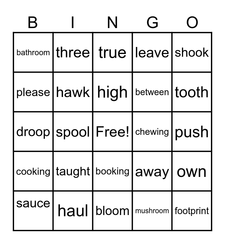 This bingo card has a free space and 29 words: sauce, firewood, spool, saw, bathroom, true, hawk, taught, chewing, haul, push, footprint, bloom, mushroom, tooth, cartoon, booking, cooking, shook, droop, away, follow, between, please, leave, three, own, high and yellow.