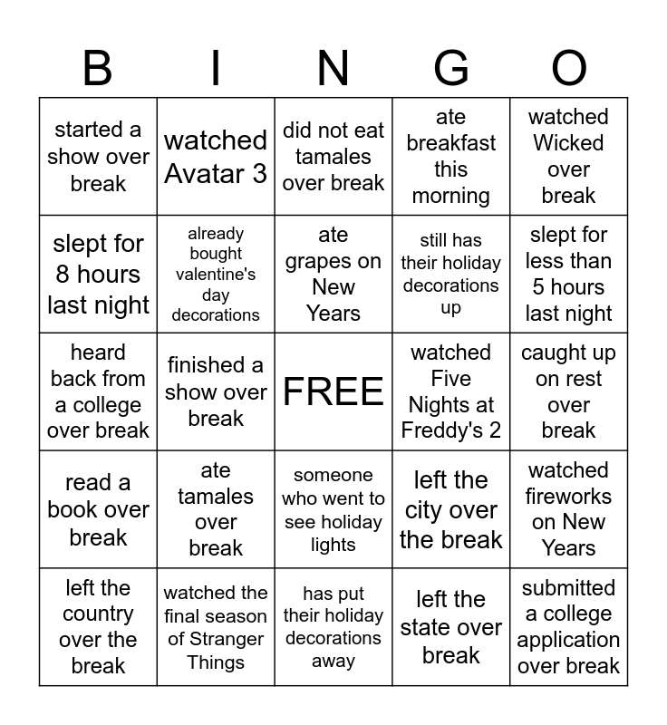 This bingo card has a free space and 24 words: ate tamales over break, watched the final season of Stranger Things, ate grapes on New Years, left the country over the break, watched Wicked over break, started a show over break, slept for 8 hours last night, watched Avatar 3, watched Five Nights at Freddy's 2, someone who went to see holiday lights, still has their holiday decorations up, heard back from a college over break, left the city over the break, watched fireworks on New Years, already bought valentine's day decorations, left the state over break, caught up on rest over break, did not eat tamales over break, slept for less than 5 hours last night, finished a show over break, submitted a college application over break, read a book over break, ate breakfast this morning and has put their holiday decorations away.