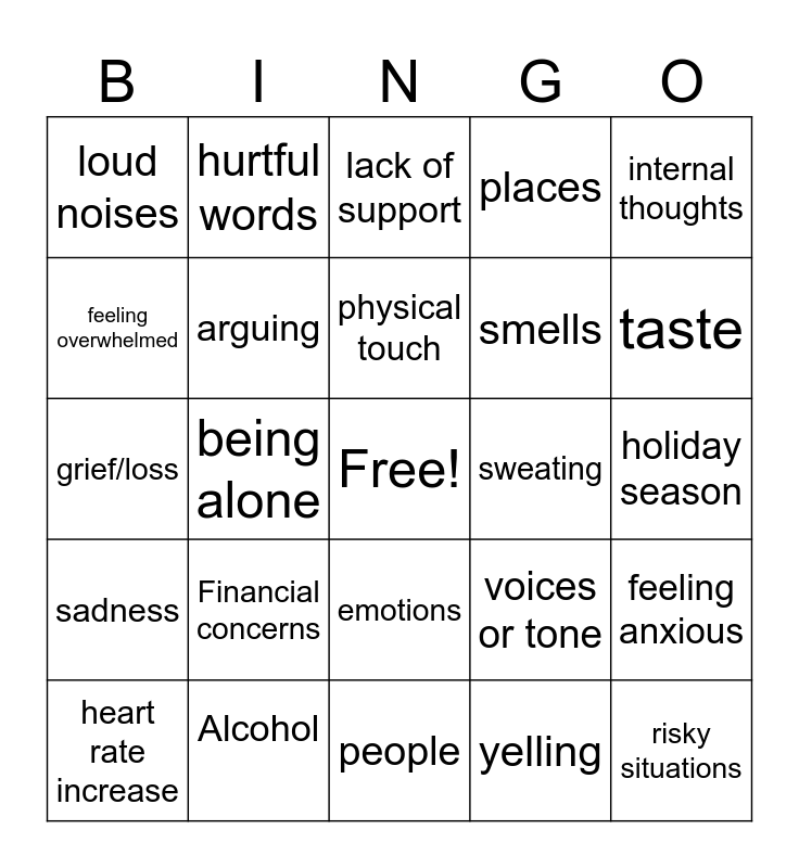 This bingo card has a free space and 24 words: Financial concerns, Alcohol, physical touch, heart rate increase, internal thoughts, loud noises, feeling overwhelmed, hurtful words, sweating, emotions, smells, grief/loss, voices or tone, feeling anxious, arguing, yelling, holiday season, lack of support, taste, being alone, risky situations, sadness, places and people.