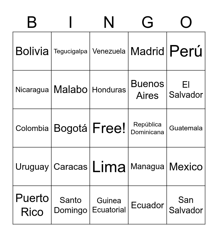 This bingo card has a free space and 42 words: México D.F., Honduras, San José, Caracas, Ecuador, Mexico, San Salvador, Costa Rica, Venezuela, Lima, Guatemala, El Salvador, Bogotá, Perú, La ciudad de Guatemala, Managua, Panamá, Colombia, La Paz; Sucre, Tegucigalpa, Nicaragua, La ciudad de Panamá, Quito, Bolivia, Santiago, Chile, Buenos Aires, Argentina, Asunción, Paraguay, Montevideo, Uruguay, Malabo, Guinea Ecuatorial, San Juan, Puerto Rico, Santo Domingo, República Dominicana, La Habana, Cuba, Madrid and España.