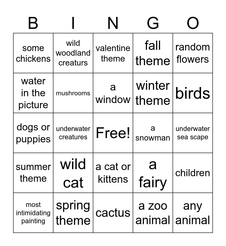 This bingo card has a free space and 24 words: wild cat, spring theme, a window, most intimidating painting, random flowers, some chickens, water in the picture, wild woodland creaturs, a snowman, a cat or kittens, winter theme, dogs or puppies, a fairy, children, mushrooms, a zoo animal, underwater sea scape, valentine theme, birds, underwater creatures, any animal, summer theme, fall theme and cactus.