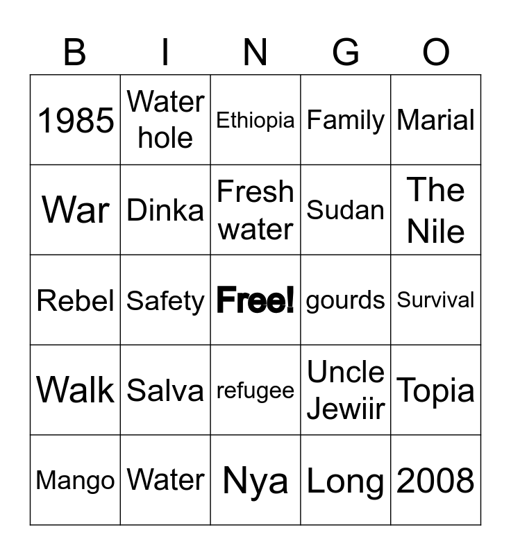 This bingo card has a free space and 24 words: Salva, Water, Fresh water, Mango, Marial, 1985, War, Water hole, gourds, refugee, Sudan, Rebel, Uncle Jewiir, Topia, Dinka, Long, Survival, Ethiopia, The Nile, Safety, 2008, Walk, Family and Nya.