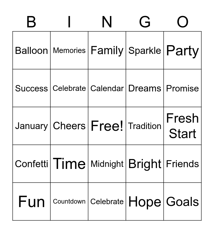 This bingo card has a free space and 40 words: New Year, January, Resolution, Celebrate, Countdown, Midnight, Calendar, Fireworks, Party, Confetti, Cheers, Sparkle, Goals, Fresh Start, Tradition, Time, Clock, Balloon, Music, Family, Friends, Hope, Dreams, Success, Reflection, Change, Future, Beginning, Year, Holiday, Smile, Fun, Joy, Bright, Promise, Celebrate, Excitement, Together, Memories and Wishes.