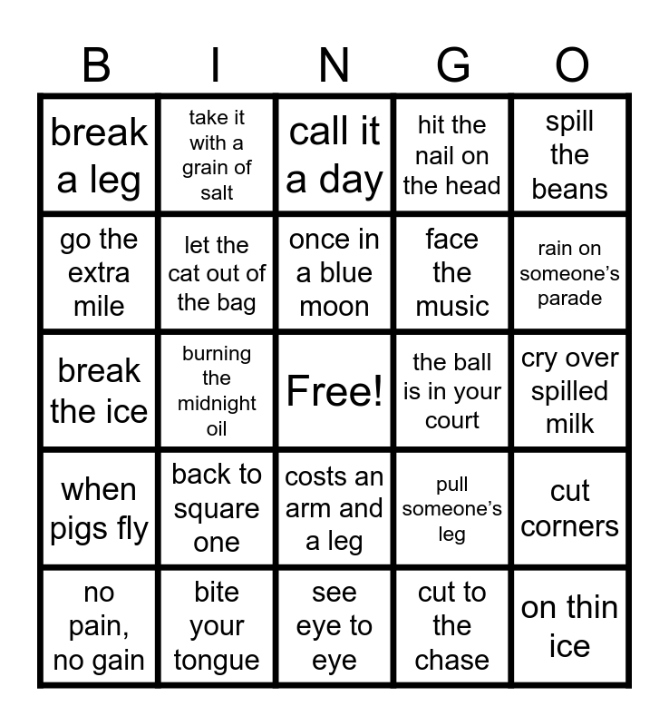 This bingo card has a free space and 40 words: a piece of cake, break the ice, hit the books, let the cat out of the bag, bite your tongue, costs an arm and a leg, once in a blue moon, under the weather, spill the beans, when pigs fly, burning the midnight oil, hit the nail on the head, on thin ice, cry over spilled milk, the ball is in your court, back to square one, bite off more than you can chew, break a leg, by the skin of your teeth, call it a day, cut corners, cut to the chase, face the music, go the extra mile, hit the sack, in hot water, jump on the bandwagon, keep your chin up, let sleeping dogs lie, make a long story short, miss the boat, no pain, no gain, once bitten, twice shy, pull someone’s leg, rain on someone’s parade, see eye to eye, sit on the fence, steal someone’s thunder, take it with a grain of salt and the best of both worlds.