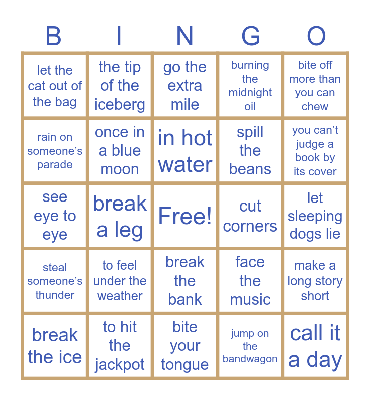 This bingo card has a free space and 55 words: a piece of cake, break the ice, hit the books, let the cat out of the bag, bite your tongue, costs an arm and a leg, once in a blue moon, under the weather, spill the beans, when pigs fly, burning the midnight oil, hit the nail on the head, on thin ice, cry over spilled milk, the ball is in your court, back to square one, bite off more than you can chew, break a leg, by the skin of your teeth, call it a day, cut corners, cut to the chase, face the music, go the extra mile, hit the sack, in hot water, jump on the bandwagon, keep your chin up, let sleeping dogs lie, make a long story short, miss the boat, no pain, no gain, once bitten, twice shy, pull someone’s leg, rain on someone’s parade, see eye to eye, sit on the fence, steal someone’s thunder, take it with a grain of salt, the best of both worlds, the tip of the iceberg, through thick and thin, time flies, to be on cloud nine, to feel under the weather, to hit the jackpot, to let someone off the hook, to pay through the nose, to take the bull by the horns, you can’t judge a book by its cover, barking up the wrong tree, hit the road, on cloud nine, break the bank and add fuel to the fire.